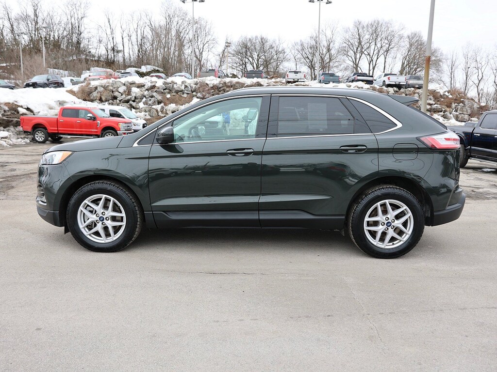 Certified. Forged Green Metallic 2022 Ford Edge SEL AWD 8-Speed Automatic EcoBoost 2.0L I4 GTDi DOHC Turbocharged VCT Fresh Oil Change, 110V/150W AC Power Outlet, 3.80 Axle Ratio, 4-Wheel Disc Brakes, 6 Speakers, ABS brakes, ActiveX Seating Material Heated Bucket Seats, Air Conditioning, Alloy wheels, AM/FM radio: SiriusXM with 360L, Auto High-beam Headlights, Auto-dimming Rear-View mirror, Automatic temperature control, Brake assist, Bumpers: body-color, Compass, Convenience Package, Delay-off headlights, Driver door bin, Driver vanity mirror, Dual front impact airbags, Dual front side impact airbags, Electronic Stability Control, Emergency communication system: SYNC 4 911 Assist, Equipment Group 201A, Fog Lamps w/Chrome Bezel, FordPass Connect, Four wheel independent suspension, Front & Rear Floor Liners w/Carpet Mats, Front anti-roll bar, Front Bucket Seats, Front Center Armrest w/Storage, Front dual zone A/C, Front reading lights, Fully automatic headlights, Heated door mirrors, Heated front seats, Heated Steering Wheel, Illuminated entry, Knee airbag, Low tire pressure warning, Occupant sensing airbag, Outside temperature display, Overhead airbag, Overhead console, Panic alarm, Passenger door bin, Passenger vanity mirror, Perimeter Alarm, Power door mirrors, Power driver seat, Power Liftgate, Power passenger seat, Power steering, Power windows, Radio: AM/FM Stereo/MP3 Capable, Rear anti-roll bar, Rear Parking Sensors, Rear reading lights, Rear seat center armrest, Rear window defroster, Rear window wiper, Remote keyless entry, Remote Start System, SecuriCode Keyless Entry Keypad, Silver Roof-Rack Side Rails, SiriusXM w/360L, Speed control, Speed-Sensitive Wipers, Split folding rear seat, Spoiler, Steering wheel mounted audio controls, SYNC 4A w/Enhanced Voice Recognition, Tachometer, Telescoping steering wheel, Tilt steering wheel, Traction control, Trip computer, Universal Garage Door Opener (UGDO), Variably intermittent wipers, Wheels: 18" Sparkle Silver-Painted Aluminum, Wireless Charging Pad.