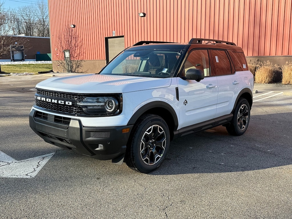 Oxford White 2025 Ford Bronco Sport Outer Banks 4WD 8-Speed Automatic 1.5L EcoBoost Fresh Oil Change, 360-Degree Camera w/Trail & Split View, 4-Wheel Disc Brakes, 6 Speakers, ABS brakes, Air Conditioning, Alloy wheels, AM/FM radio: SiriusXM, AM/FM Stereo, Auto High-beam Headlights, Auto-dimming Rear-View mirror, Automatic temperature control, B&O Sound System by Bang & Olufsen, Brake assist, Compass, Connected Navigation, Delay-off headlights, Driver door bin, Driver vanity mirror, Dual front impact airbags, Dual front side impact airbags, Electronic Stability Control, Emergency communication system: SYNC 4 911 Assist, Equipment Group 300A, Four wheel independent suspension, Front & Rear Floor Liners w/o Carpet Mats, Front anti-roll bar, Front Bucket Seats, Front Center Armrest, Front Driver/Passenger Seat Back Map Pockets, Front dual zone A/C, Front fog lights, Front License Plate Bracket, Front Parking Sensors, Front reading lights, Fully automatic headlights, Garage door transmitter, HD Radio, Heated door mirrors, Heated front seats, Heated steering wheel, Illuminated entry, Knee airbag, Low tire pressure warning, Memory seat, Occupant sensing airbag, Outer Banks Tech Package+, Outside temperature display, Overhead airbag, Overhead console, Panic alarm, Passenger door bin, Passenger vanity mirror, Power door mirrors, Power driver seat, Power passenger seat, Power steering, Power windows, Premium Trimmed Front Bucket Seats w/Ebony/Roast, Radio data system, Rain sensing wipers, Rear anti-roll bar, Rear Parking Sensors, Rear reading lights, Rear seat center armrest, Rear window defroster, Rear window wiper, Remote keyless entry, Reverse Brake Assist, Security system, SiriusXM, Speed control, Speed-sensing steering, Speed-Sensitive Wipers, Split folding rear seat, Steering wheel mounted audio controls, SYNC 4 w/Enhanced Voice Recognition, Tachometer, Telescoping steering wheel, Tilt steering wheel, Traction control, Trip computer, Variably intermittent wipers, Wheels: 18" Ebony Black-Painted Aluminum.