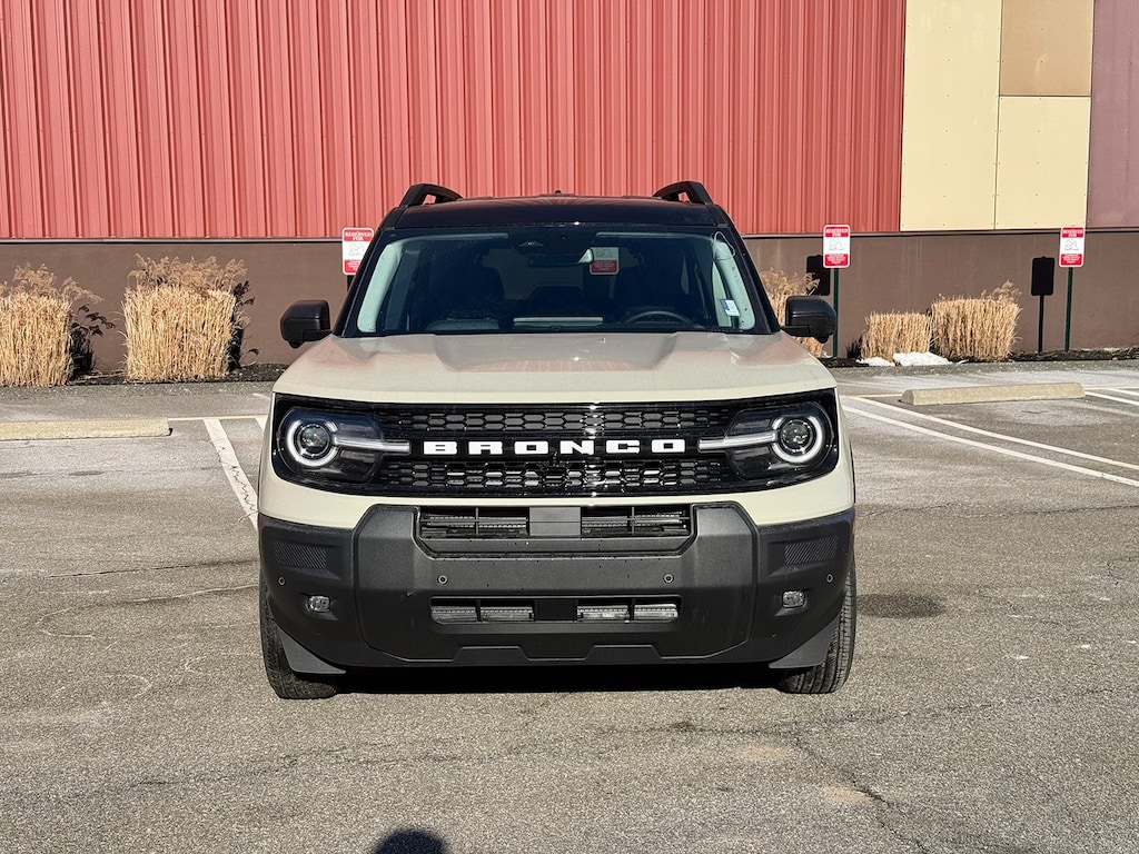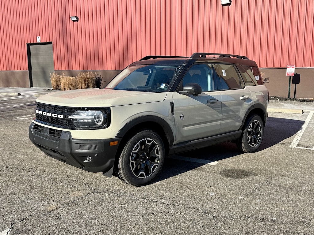 Desert Sand 2025 Ford Bronco Sport Outer Banks 4WD 8-Speed Automatic 1.5L EcoBoost Fresh Oil Change, 360-Degree Camera w/Trail & Split View, 4-Wheel Disc Brakes, 6 Speakers, ABS brakes, Air Conditioning, Alloy wheels, AM/FM radio: SiriusXM, AM/FM Stereo, Auto High-beam Headlights, Auto-dimming Rear-View mirror, Automatic temperature control, B&O Sound System by Bang & Olufsen, Brake assist, Compass, Connected Navigation, Delay-off headlights, Driver door bin, Driver vanity mirror, Dual front impact airbags, Dual front side impact airbags, Electronic Stability Control, Emergency communication system: SYNC 4 911 Assist, Equipment Group 300A, Four wheel independent suspension, Front anti-roll bar, Front Bucket Seats, Front Center Armrest, Front Driver/Passenger Seat Back Map Pockets, Front dual zone A/C, Front fog lights, Front License Plate Bracket, Front Parking Sensors, Front reading lights, Fully automatic headlights, Garage door transmitter, HD Radio, Heated door mirrors, Heated front seats, Heated steering wheel, Illuminated entry, Knee airbag, Low tire pressure warning, Memory seat, Occupant sensing airbag, Outer Banks Tech Package+, Outside temperature display, Overhead airbag, Overhead console, Panic alarm, Passenger door bin, Passenger vanity mirror, Power door mirrors, Power driver seat, Power passenger seat, Power steering, Power windows, Premium Trimmed Front Bucket Seats w/Ebony/Roast, Premium Trimmed Front Bucket Seats w/Platinum Blue, Radio data system, Rain sensing wipers, Rear anti-roll bar, Rear Parking Sensors, Rear reading lights, Rear seat center armrest, Rear window defroster, Rear window wiper, Remote keyless entry, Reverse Brake Assist, Security system, SiriusXM, Speed control, Speed-sensing steering, Speed-Sensitive Wipers, Split folding rear seat, Steering wheel mounted audio controls, SYNC 4 w/Enhanced Voice Recognition, Tachometer, Telescoping steering wheel, Tilt steering wheel, Traction control, Trip computer, Variably intermittent wipers, Wheels: 18" Ebony Black-Painted Aluminum.