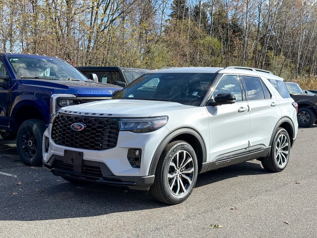 Space White Metallic 2026 Ford Explorer ST-Line 4WD 10-Speed Automatic 2.3L EcoBoost I-4 Dealer Detailed, Oil Change, Dealer Inspected, 10 Speakers, 2nd Row Captain's Chairs w/E-Z Entry & Armrest, 3rd row seats: bench, 4-Wheel Disc Brakes, ABS brakes, Air Conditioning, Alloy wheels, AM/FM radio: SiriusXM with 360L, Apple CarPlay/Android Auto, Auto High-beam Headlights, Automatic temperature control, BlueCruise (Equipment + 1-Year + 90-Day Plan), BlueCruise Hardware, Brake assist, Bumpers: body-color, Compass, Delay-off headlights, Driver door bin, Driver vanity mirror, Dual front impact airbags, Dual front side impact airbags, Electronic Stability Control, Emergency communication system: 911 Assist, Equipment Group 300A Standard Package, Exterior Parking Camera Rear, Four wheel independent suspension, Front & 2nd Rows Floor Liners w/Carpet Floor Mats, Front anti-roll bar, Front Bucket Seats, Front Center Armrest, Front dual zone A/C, Front fog lights, Front License Plate Bracket, Front reading lights, Fully automatic headlights, Garage door transmitter, Heated door mirrors, Heated front seats, Heated steering wheel, Heated Unique Cloth Captain's Chairs, Illuminated entry, Knee airbag, Leather steering wheel, Low tire pressure warning, Navigation System, Occupant sensing airbag, Outside temperature display, Overhead airbag, Overhead console, Panic alarm, Passenger door bin, Passenger vanity mirror, Power door mirrors, Power driver seat, Power Liftgate, Power passenger seat, Power steering, Power windows, Radio: B&O Sound System by Bang & Olufsen, Rear air conditioning, Rear anti-roll bar, Rear reading lights, Rear window defroster, Rear window wiper, Remote keyless entry, Security system, Speed control, Speed-sensing steering, Speed-Sensitive Wipers, Split folding rear seat, Spoiler, Steering wheel mounted audio controls, Tachometer, Telescoping steering wheel, Tilt steering wheel, Traction control, Trip computer, Variably intermittent wipers, Wheels: 20" Ebony-Painted Machined Aluminum.