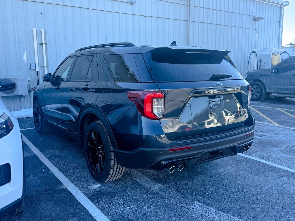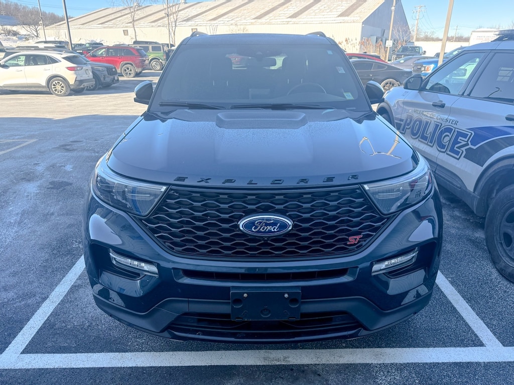 Certified. Blue Metallic 2023 Ford Explorer ST 4WD 10-Speed Automatic 3.0L EcoBoost V6 Dealer Detailed, Oil Change, Dealer Inspected, 10.1" LCD Capacitive Portrait Touchscreen, 110V/150W AC Power Outlet, 2 Additional Speakers, 20" Machined Aluminum w/Painted Pockets Wheels, 2nd Row 35/30/35 Bench w/E-Z Entry & Armrest, 3.58 Non-Limited-Slip Rear Axle Ratio, 360-Degree Camera w/Split View, 3rd row seats: bench, 4-Wheel Disc Brakes, 4G LTE Wi-Fi Hotspot Credit, 6 Speakers, ABS brakes, Air Conditioning, Alloy wheels, AM/FM radio: SiriusXM, AM/FM Stereo, Auto High-beam Headlights, Auto-Dimming Rearview Mirror (Interior), Automatic temperature control, Brake assist, Bumpers: body-color, Compass, Delay-off headlights, Driver door bin, Driver vanity mirror, Dual front impact airbags, Dual front side impact airbags, Electronic Stability Control, Emergency communication system: SYNC 3 911 Assist, Equipment Group 401A, Evasive Steering Assist, Exterior Parking Camera Rear, Ford Co-Pilot360 Assist+, FordPass Connect, Four wheel independent suspension, Front & Second Row Floor Liners (16B), Front anti-roll bar, Front Bucket Seats, Front Center Armrest, Front dual zone A/C, Front fog lights, Front License Plate Bracket, Front Parking Sensors, Front Rain-Sensing Wipers, Front reading lights, Fully automatic headlights, Heated door mirrors, Heated front seats, Heated steering wheel, Illuminated entry, Intelligent Adaptive Cruise Control, Knee airbag, Leather Htd/Ventilated Sport Captain's Chairs, Leather steering wheel, Low tire pressure warning, Memory Driver's Seat, Memory seat, Occupant sensing airbag, Outside temperature display, Overhead airbag, Overhead console, Panic alarm, Passenger door bin, Passenger vanity mirror, Performance Front & Rear Brakes, Power door mirrors, Power driver seat, Power Liftgate, Power passenger seat, Power steering, Power Tilt/Telescoping Steering Column, Power windows, Radio: B&O Sound System by Bang & Olufsen, Rear air conditioning, Rear anti-roll bar, Rear reading lights, Rear window defroster, Rear window wiper, Remote keyless entry, Reverse Brake Assist, Second Row Heated Seats, Security system, SelectShift Capability w/Paddle Shifters, Sideview Mirrors w/Gloss Black Caps, Speed control, Speed Sign Recognition, Speed-sensing steering, Speed-Sensitive Wipers, Split folding rear seat, Spoiler, Sport steering wheel, ST High Package, ST Street Pack, Steering wheel mounted audio controls, SYNC 3 Communications & Entertainment System, SYNC 3/Apple CarPlay/Android Auto, Tachometer, Technology Package, Telescoping steering wheel, Third Row PowerFold (Folds Flat), Tilt steering wheel, Traction control, Trip computer, Twin Panel Moonroof, Universal Garage Door Opener (UGDO), Variably intermittent wipers, Ventilated front seats, Voice-Activated Touchscreen Navigation System, Wheels: 21" Aluminum, Wireless Charging Pad.