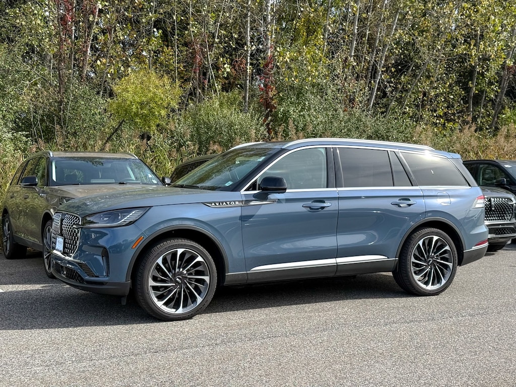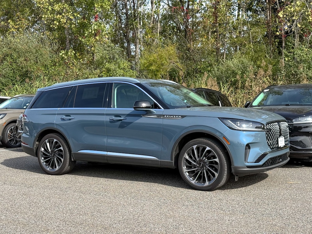 Certified. Blue Metallic 2025 Lincoln Aviator Reserve AWD 10-Speed Automatic 3.0L V6 Dealer Detailed, Oil Change, Dealer Inspected, 14 Speakers, 2nd Row Bench Seat, 30-Way Perfect Position Seats w/Active Motion, 3rd row seats: split-bench, 4-Wheel Disc Brakes, 40/Mini Console/40 Dual Captain's Chairs, ABS brakes, Adaptive Dynamic Bending Lighting, Adaptive Pixel LED Headlamps, Adaptive suspension, Advanced Heads-Up Display, Air Conditioning, All-Weather 1st & 2nd Row Floor Liners (16A), Alloy wheels, AM/FM radio: SiriusXM, Apple CarPlay/Android Auto, Audio memory, Auto Air Refresh, Auto High-beam Headlights, Auto-dimming door mirrors, Auto-dimming Rear-View mirror, Automatic temperature control, Brake assist, Bumpers: body-color, Compass, Delay-off headlights, Driver door bin, Driver vanity mirror, Dual front impact airbags, Dual front side impact airbags, Electronic Stability Control, Emergency communication system: 911 Assist, Equipment Group 201A, Four wheel independent suspension, Front anti-roll bar, Front Bucket Seats, Front Center Armrest, Front dual zone A/C, Front License Plate Bracket, Front reading lights, Fully automatic headlights, Garage door transmitter, Genuine wood console insert, Genuine wood dashboard insert, Heads-Up Display, Heated & Ventilated Rear Seats, Heated door mirrors, Heated front seats, Heated steering wheel, HVAC memory, Illuminated entry, Illuminated Lincoln Star in Grille, Illumination Package, Knee airbag, Leather steering wheel, Lincoln BlueCruise Equipped (4-Years Included), Lincoln Digital Experience, Lincoln Dynamic Signature Lighting, Low tire pressure warning, Luxury Package, Memory seat, Navigation system: Connected Navigation (1-year trial), Occupant sensing airbag, Outside temperature display, Overhead airbag, Overhead console, Panic alarm, Passenger door bin, Passenger vanity mirror, Power door mirrors, Power driver seat, Power Liftgate, Power moonroof: Panoramic Vista Roof, Power passenger seat, Power steering, Power windows, Premium Lthr Heated/Ventilated Fnt Captain's Chairs, Radio data system, Radio: Revel Audio System w/14 Speakers, Radio: Revel Ultima 3D Audio System w/28 Speakers, Rain sensing wipers, Rear air conditioning, Rear anti-roll bar, Rear audio controls, Rear dual zone A/C, Rear reading lights, Rear window defroster, Rear window wiper, Remote keyless entry, Security system, SiriusXM, Speed control, Speed Dependent Lighting, Speed-Sensitive Wipers, Split folding rear seat, Spoiler, Steering wheel memory, Steering wheel mounted A/C controls, Steering wheel mounted audio controls, Tachometer, Telescoping steering wheel, Tilt steering wheel, Traction control, Trip computer, Turn signal indicator mirrors, Variably intermittent wipers, Ventilated front seats, Wheels: 21" Bright-Machined Aluminum, Wheels: 22" Bright-Machined Aluminum, Wireless Charging Pad.